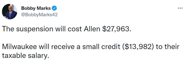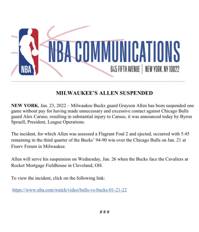 178直播01月24日讯 卡鲁索右手腕骨折,需要休战至少6-8周,这也让对他恶意犯规的格雷森-阿伦成为口诛笔伐的对象。NBA官宣禁赛阿伦一场,将在雄鹿对骑士的比赛中生效。阿伦损失27963美元薪水,雄鹿节省13982美元奢侈税。这位雄鹿后卫也在自己的Discord社媒上正式回应了弄伤卡鲁索一事,他坚持表示自己绝非故意这么做,另外也解释了自己在场边露出笑容的原因。