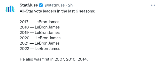StatMuse列出了詹姆斯成为票王的年份。算上今年,他将连续6年成为全明星票王(2017-2022),此外,他还在2007年、2010年和2014年成为票王。9次成为全明星票王,詹姆斯将追平乔丹的神迹,票王次数并列历史第一。