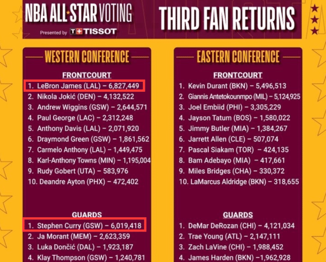 也就是说,詹姆斯短短2周净胜库里近137万票,人气确实太高了。距离全明星投票截止只剩下最后3天,按照这个趋势来看,勒布朗生涯第9次票王大概率是稳了。