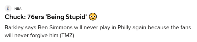 178直播01月19日讯 ,名宿查尔斯-巴克利在接受TMZ体育采访时,怒斥76人管理层太愚蠢,并直言费城球迷永远不会原谅西蒙斯。他建议76人赶快给火箭等多支球队打电话,送走西蒙斯。