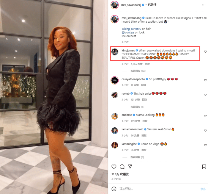 37岁詹姆斯第一时间在评论区留言,写道:当你走下楼的时候,我对自己说:我的天!那是我的(老婆)!(7个火表情)就是那么美,我的女王!(7个色眯眯的表情) 。