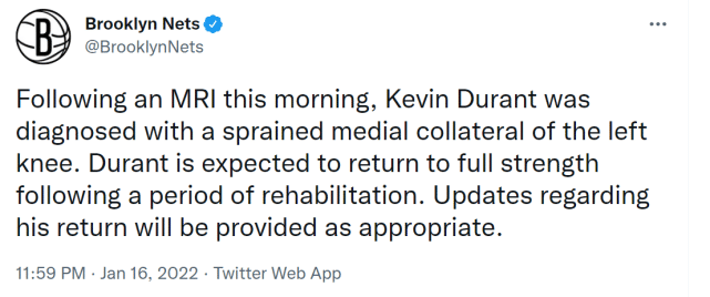 178直播01月17日讯 ,篮网官方宣布,通过核磁共振检查,凯文-杜兰特被确诊为左膝内侧副韧带扭伤,经过一段时间的康复治疗后,他预计会完全恢复健康。随后,ESPN记者沃纳罗斯基表示,篮网内部乐观估计杜兰特会在4-6周后回归赛场。赛季至今,杜兰特为篮网出战36场,场均出战36.5分钟,贡献29.3分7.4篮板5.8助攻。
