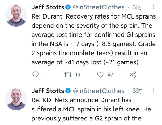联盟伤病专家Jeff Stotts表示,从NBA球员角度来看,这一伤病的一级扭伤恢复期平均是17天,平均错过8.5场比赛;二级扭伤恢复期平均是41天,平均错过21场比赛。
