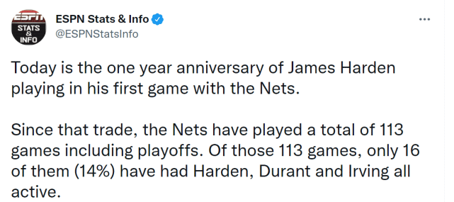 ESPN数据显示,自从篮网换来哈登后,他们已经打了113场比赛(包括季后赛),在这113场比赛里,只有16场(占14%)比赛哈登、杜兰特、欧文能同时上场。