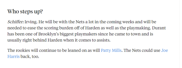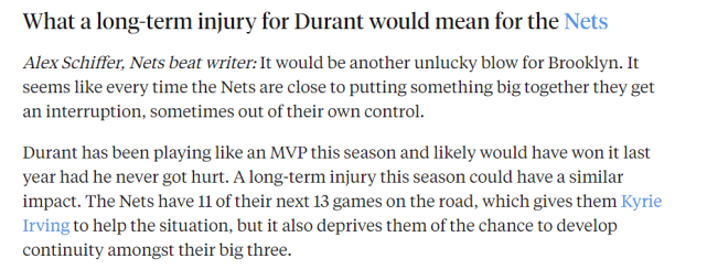 对于篮网来说,也是一大打击,毕竟杜兰特是篮网的头号进攻火力点,缺少了他这样的大杀器,篮网无疑要面对巨大的压力。Schiffer表示从受伤的时间来看,真是再糟糕不过了。因为篮网即将迎来四连客之旅,未来13场比赛有11场是客场。欧文能打这11场比赛,这本该是三巨头和全队磨合的最佳时段,但他们再一次错过了提升球队化学反应的机会。