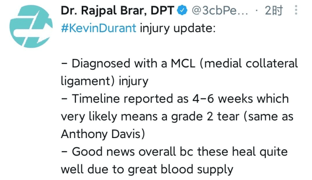 他的伤势有多严重?医学专家Rajpal Brar表示,ESPN报道预计康复周期是4-6周,意味着杜兰特很可能遭遇的是二级扭伤,和此前的浓眉伤病是一样的。好消息是由于该区域的供血充足,预计恢复效果会不错。另一位医学专家Nirav Pandya也给出了不同级别扭伤的恢复期,一级(韧带微小撕裂)是1-2周,二级(韧带部分撕裂)是4-6周,三级(韧带完全撕裂)是3个月。