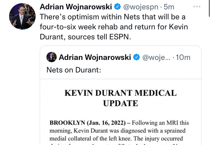 178直播01月17日讯 ,篮网官宣布了杜兰特的伤情,膝盖MRI检测结果,显示杜兰特遭遇了左膝内侧副韧带扭伤,将会缺席一段时间。很快名记就透露,称内部乐观认为,杜兰特将在4-6周的康复治疗后复出。也就是说,杜兰特的伤病恢复,至少需要4-6周的时间,这期间他将无缘比赛。