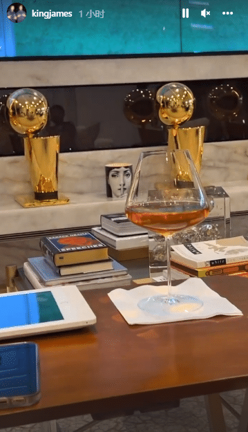 不过惨败之后,詹姆斯已经调整心情,不久前老詹晒出自己在家中喝红酒并且看比赛的画面,电视机前的四座总冠军奖杯十分抢镜。
