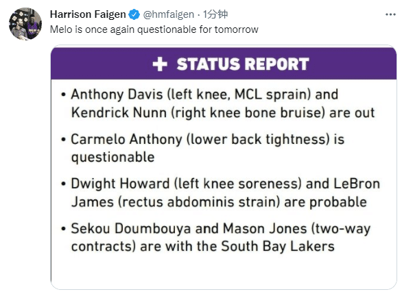 178直播01月17日讯 ,湖人公布下一场对阵爵士的伤病报告,浓眉(左膝韧带扭伤)和纳恩(右膝骨挫伤)因伤继续休战,安东尼(背部痉挛)出战成疑,詹姆斯(腹部伤势)和霍华德(左膝酸痛)都是大概率出战,敦布亚和梅森-琼斯两名双向合同仍留在发展联盟。