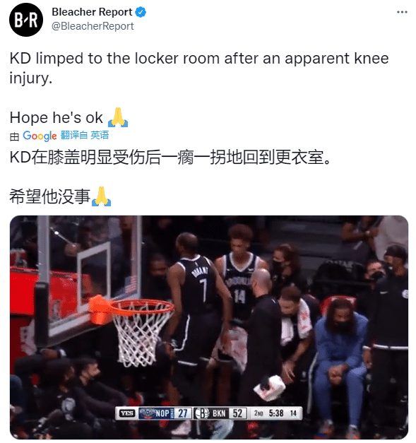 第二节5分多钟,杜兰特上场没多久就遭遇伤病,无意识被倒地的小布朗撞伤膝盖,之后杜兰特捂着膝盖,走到场边示意纳什喊暂停,之后杜兰特走回更衣室,如此伤病令人担忧。