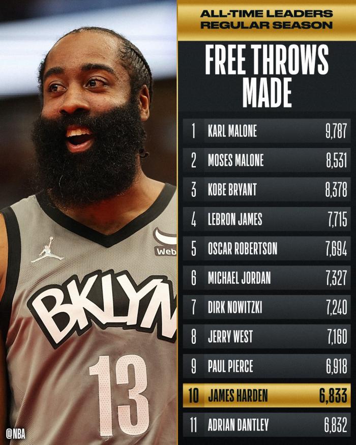 第一、哈登罚球命中数超越丹特利升到历史第十位。