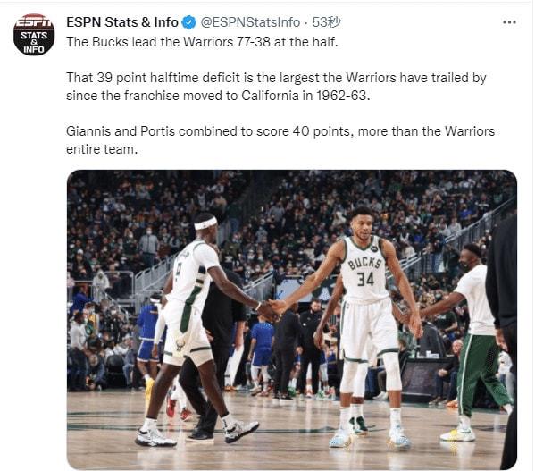 第二节比赛,雄鹿队这边依旧是来势汹汹,字母哥更是多次秀出了暴扣,甚至连运气都站在了雄鹿队这边,波蒂斯半场压哨三分也命中,第二节比赛,雄鹿队拿到了40分,他们的防守让勇士队仅仅拿到了17分,单节赢下了23分,半场比赛结束,雄鹿队以77:38领先勇士队39分。