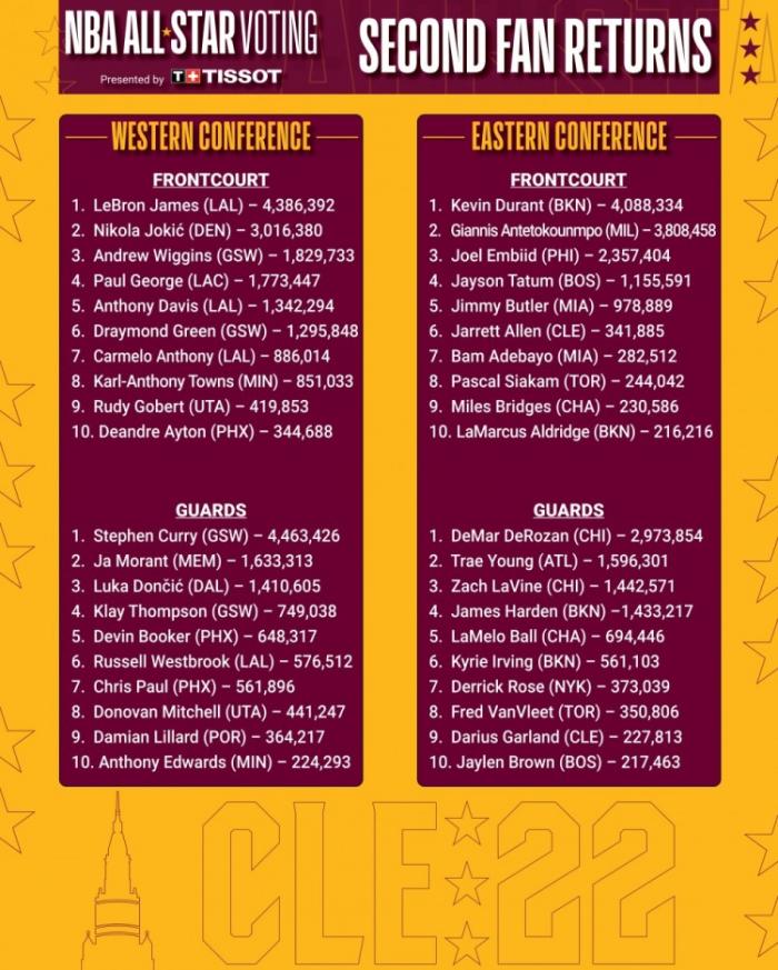 除了詹姆斯,在全明星票选前十榜单上,湖人队上榜的球员还有浓眉1342294票、安东尼886014票和威少576512票;全联盟仅有詹姆斯、库里和杜兰特三人得票突破400万大关,詹库激烈争夺西部第一,杜兰特继续领跑东部。