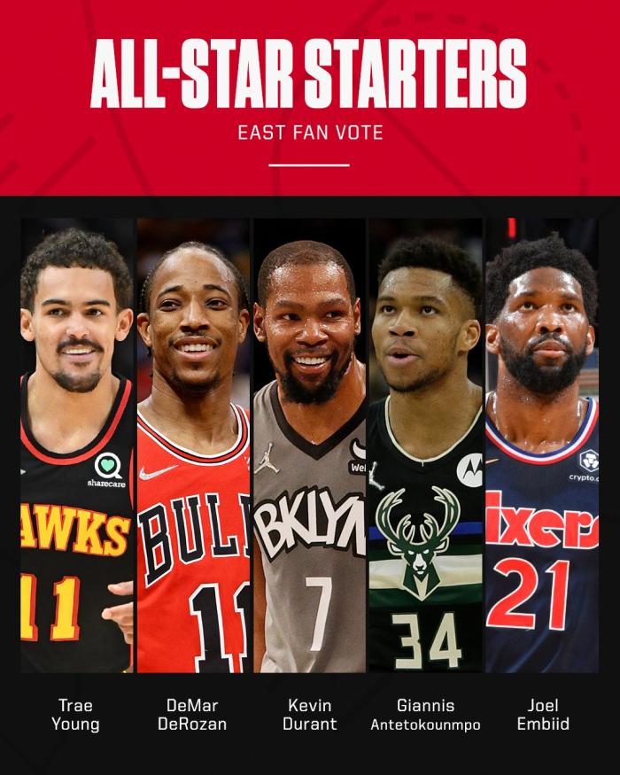 按照目前的球迷票选结果,东部全明星首发五虎是杜兰特、字母哥、恩比德、特雷-杨和德罗赞;西部全明赛首发是詹姆斯、库里、莫兰特、维金斯和约基奇。