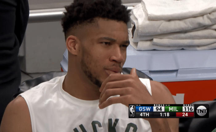 雄鹿大胜赢球,字母哥坐在场边和队友闲聊,十分惬意。