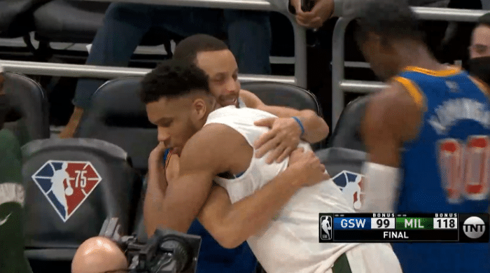 反观勇士,汤普森提前一节离场返回更衣室;库里坐在替补席十分沮丧,更是一脸苦笑尽显无奈的心情;比赛结束后,坚持看完比赛的库里“勉为其难”地站起来,和马修斯有说有笑,之后字母哥走过来,拥抱库里,此时库里满脸笑容,这应该是强颜欢笑。