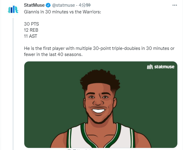 字母哥仅用29分钟便拿到职业生涯第28次三双,追平公牛名宿乔丹并列历史第17位,也成为NBA近40年第一位在30分钟以内拿到30+三双的球员;据统计,字母哥拿到三双时,雄鹿战绩是24胜4负。