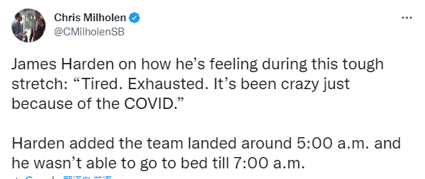 赛谈到这段时间的赛程,哈登表示:太累了,疲惫不堪。因为新冠疫情,一切都变得太疯狂了。