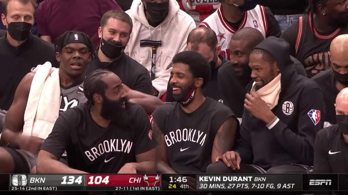 末节还剩1分46秒,镜头给到篮网替补席,杜兰特、哈登和欧文坐在场边开怀大笑,有说有笑聊起来;整个上半场,篮网和公牛打得难分难解,但篮网第三节39-19打爆公牛,期间德罗赞气得怒撕毛巾,末节篮网继续吊打公牛,杜兰特三节打卡下班。