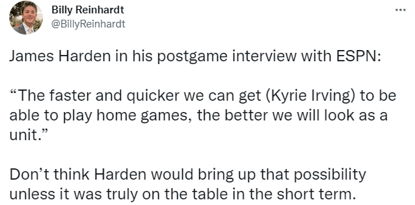 谈到欧文何时才能在主场打比赛,哈登直言:我觉得我应该给他打一针疫苗(此时哈登笑了);哈登还表示:我们能够越快让欧文打主场比赛,我们作为一个整体就会更好。
