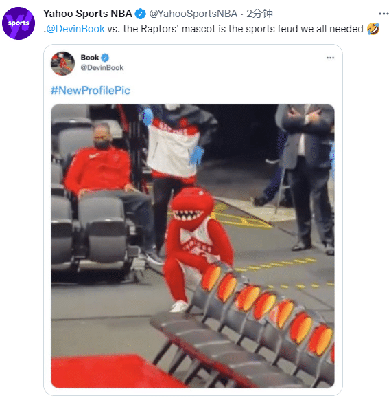 178直播01月13日讯 ,太阳球星德文-布克更换社交媒体头像引热议,布克把推特头像换成猛龙吉祥物被撵到场边的画面,配文写道:个人资料新头像;美媒Yahoo Sports NBA发推写道:布克和猛龙吉祥物是我们需要的体育世仇。