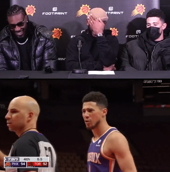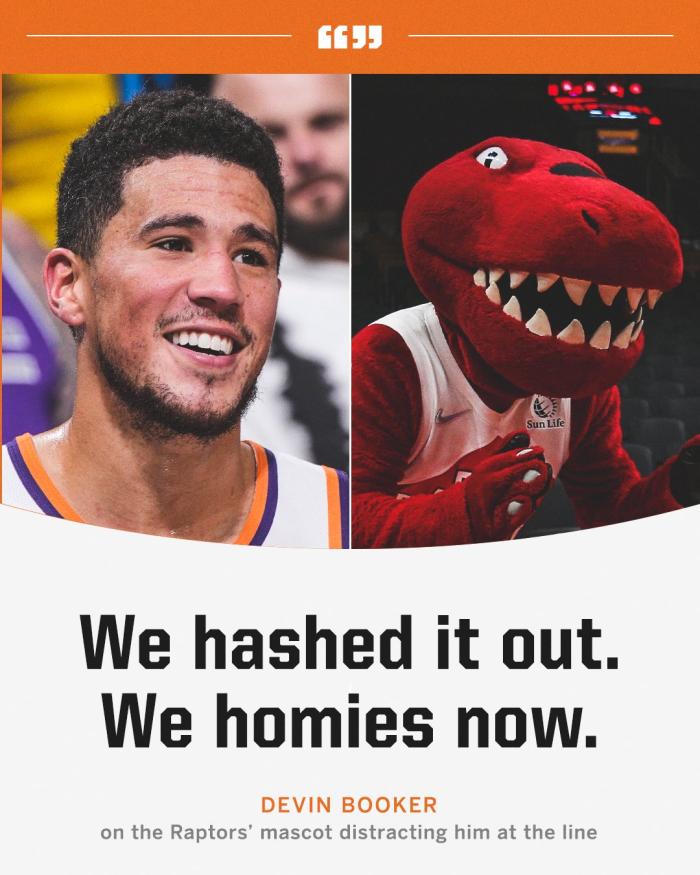 赛后谈到举报猛龙吉祥物这件事,布克表示:我们已经解决了。我们现在很亲密。我尝试让它不要挡我,这奏效了。我很高兴投篮的时候没有他站在那儿。这俩人(保罗和克劳德)也会做同样的事情(干扰投篮),那时候我就会抱怨,这就是我。