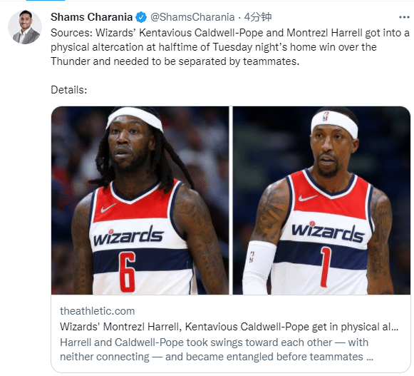 178直播01月12日讯 ,据名记shams报道,奇才队发生内讧,奇才与雷霆比赛中场休息时,波普和哈雷尔发生肢体冲突,两人挥拳相向,所幸被队友拉开,两人并没有打到对方,名记还报道这次冲突的起因。