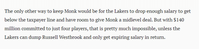 另一种留下蒙克的方法,更难做到。那就是湖人降低总薪水到奢侈税线以下,从而有空间给蒙克一份全额中产合同。可是别忘了,光是湖人年薪靠前的4名球员,就已经让球队投入1.4亿美元。除非湖人甩掉威少,收获到期合同作为回报。否则,湖人或许只能享受蒙克余下半个赛季的使用期,然后忍痛和他道别了。
