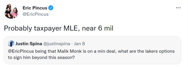 美媒近日详细解析了湖人留下蒙克的前景。根据NBA的薪金规则,除非湖人清理出薪金空间,否则他们在夏天能够支付给蒙克的最多就是奢侈税球队的中产特例(迷你中产),Bleacher Report专家Eric Pincus指出大概是一年600万美元。不过,以蒙克目前的表现来说,这样的价格很难留住他。
