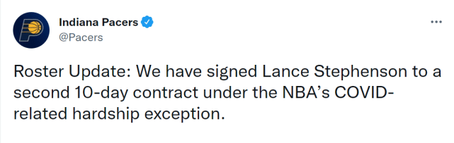 178直播01月12日讯 ,步行者官方宣布,球队已经和兰斯-史蒂芬森签下第二份10天合同,使用的依然是联盟的困难条例。此前,他们曾在1月2日和史蒂芬森签下第一份10天合同,合同到期后,史蒂芬森的表现为自己赢得了新的机会。
