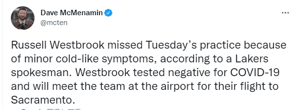 178直播01月12日讯 ,湖人全队进行了训练,这是他们本赛季第13次队内训练,不过威少因生病缺席了训练,据湖人队发言人透露,威少是因为出现感冒的症状而缺席了训练,不过威少的新冠检测呈阴性,他独自前往机场与球队会合,一起飞往萨克拉门托挑战国王。