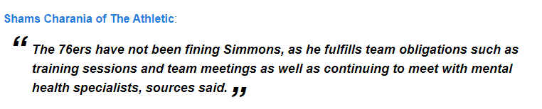 shams透露:76人队已经不再对西蒙斯进行罚款,因为他履行了球队训练和团队会议等义务,并继续与心理健康专家进行会面。