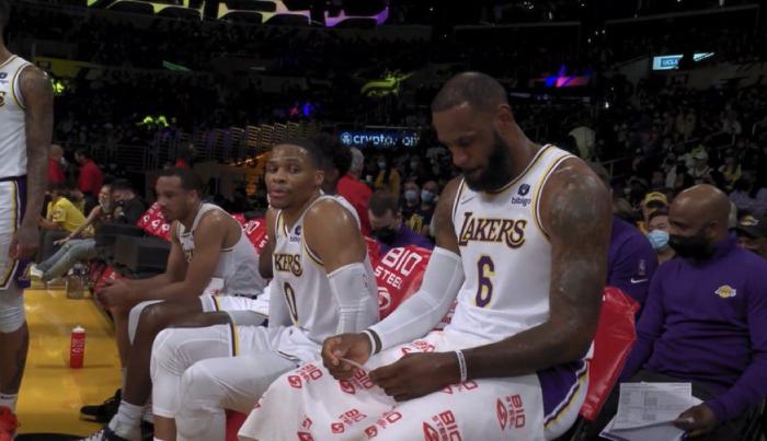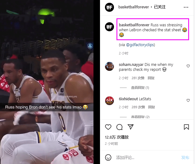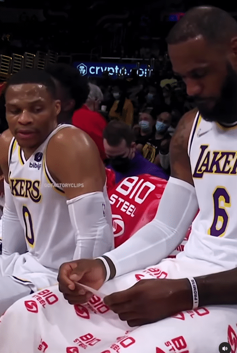 178直播01月11日讯 ,美媒BasketballForever晒出湖人替补席罕见一幕,并且配文写道:当勒布朗检查统计表时,威少很紧张;视频中配文写道:威少希望詹姆斯不要看到他的数据。
