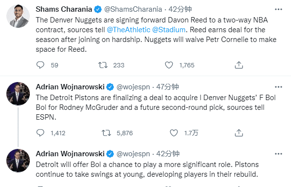 与活塞达成1换2交易后,掘金还签下达文-里德,据名记ShamsCharania报道,掘金将与前锋达文-里德签下一份双向合同,为了腾出阵容空间,掘金将会裁掉前锋彼得-科尔纳利。