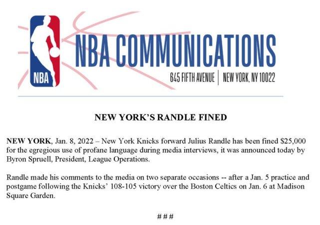 178直播01月09日讯 ,NBA官方宣布,尼克斯球员兰德尔因在采访中滥用亵渎性质的语言,而被罚款2.5万美元。他在1月6日训练和1月7日比赛之后的采访中都出现这一问题。