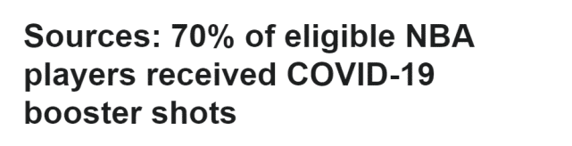 据此前ESPN报道,截至北京时间周六,联盟已经累计有314名球员触发健康安全协议,而最新报道称,NBA已有70%左右的球员选择注射加强针。