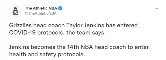 178直播01月09日讯 ,灰熊队宣布,球队主教练泰勒-詹金斯触发健康安全协议。他成为了本赛季第14位触发健康安全协议的主教练,而在他之前,莱尔、金特里、沃格尔、蒙蒂-威廉姆斯、里弗斯、马龙、比卢普斯、马克-戴格诺特、多诺万、泰伦-卢、麦克米兰、布登霍尔泽、基德都曾中招。