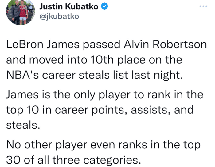 就在近日,NBA据数据专家Justin Kubatko统计,称:詹姆斯是历史上唯一一位在生涯总得分(第3)、总助攻(第8)和总抢断(第10)数据上都位列历史前十的球员。值得一提的是在NBA历史上甚至没有任何其他球员能够在这三项生涯数据统计中同时进入历史前30。