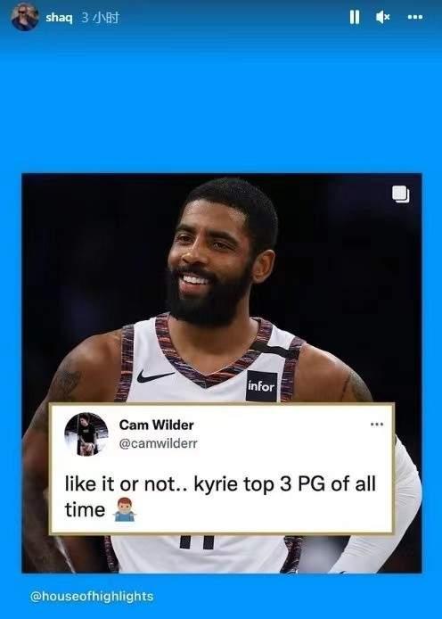 看了欧文今天无与伦比的表现,各大评论员也开始吹起了欧文。赛后,前NBA巨星奥尼尔在社交媒体转发了一位网红的言论,该网红认为:无论你喜欢与否,欧文都是历史排名前三的控球后卫。