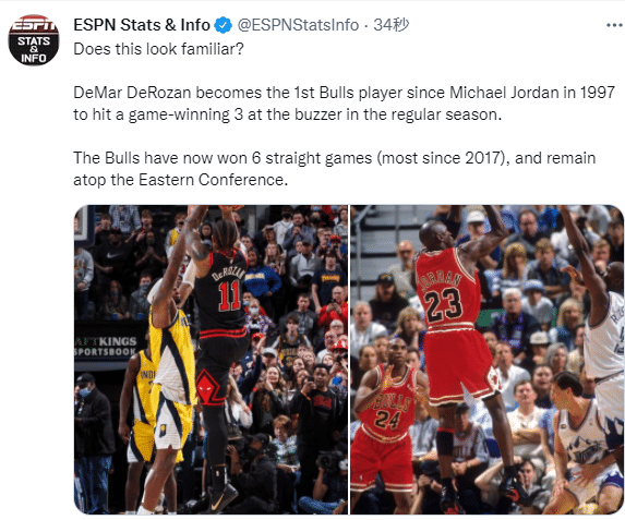 德罗赞成为自1997年迈克尔-乔丹之后首位在常规赛中命中致胜三分的公牛球员,成为公牛队史近14年第一人;目前公牛队已经取得6连胜,队史自2017年以来最多,目前公牛23胜10负,反超篮网位列东部第一。