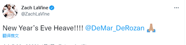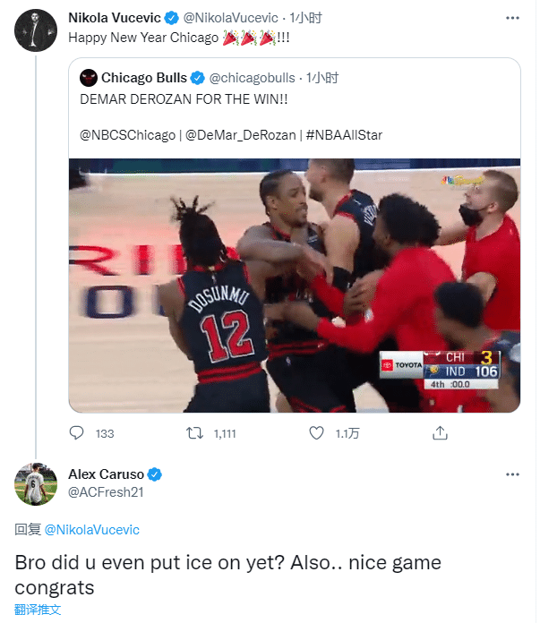 武切维奇赛后转发德罗赞绝杀视频并写道:芝加哥!新年快乐!