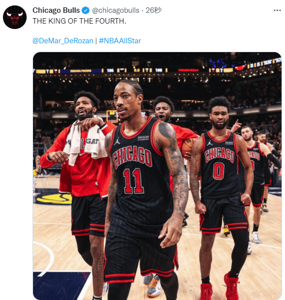 据美媒StatMuse统计,本赛季至今,德罗赞末节总共拿到232分高居联盟第一,末节场均7.7分联盟第二,命中率高达53.2%联盟第一,三分命中率50%;末节总得分好命中率都是联盟第一,公牛官方晒出德罗赞离场照,并且配文写道:末节之王。