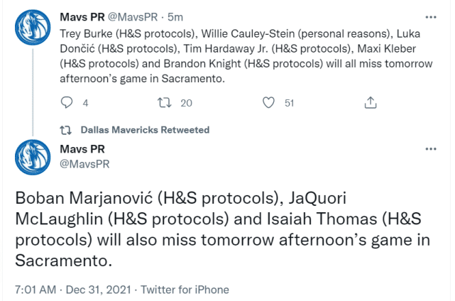 独行侠官方PR报道称,除了小托马斯,目前博班、麦克劳林、奈特、克莱伯、小哈达威、东契奇、伯克都在隔离中,考利-斯坦因个人原因也不能出战。