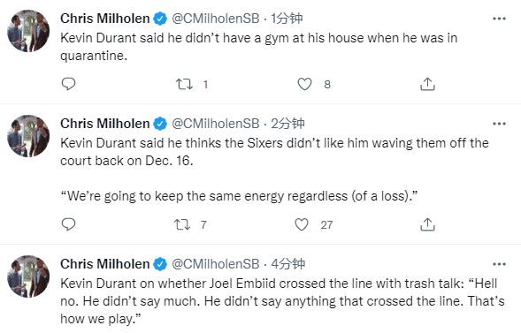 赛后谈到与恩比德互喷垃圾话,杜兰特表示:恩比德没有说太多话,他没有说越界的话,我被点燃了,那只是我们比赛的方式,我们之间只是相互尊重,自然的竞争之火就爆发了。