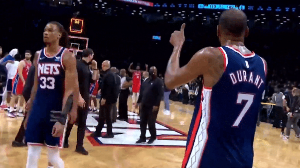 最后时刻,杜兰特和恩比德两人争吵互喷垃圾话,裁判和阿德赶紧拉开双方,最终他俩都吃到技术犯规;比赛结束后,恩比德和杜兰特仍旧交流了一番,杜兰特露出鬼魅一笑,离场前先是鼓掌,然后冲着恩比德竖起大拇指。