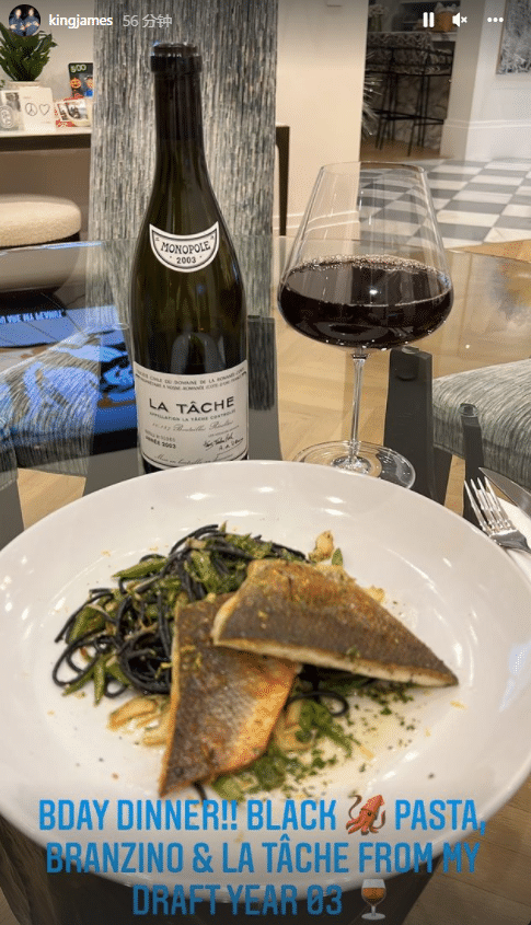 37岁詹姆斯晒出自己身穿黑色皮衣的帅照,戴着钻石项链,抽雪茄、露出霸气表情,还晒出家中的王冠标志;詹姆斯还晒出自己的生日晚餐:生日晚餐!黑鱿鱼、意面,Branzino(注:意大利语中的海鲈鱼)以及我选秀03年出品的LA TACHE红酒。