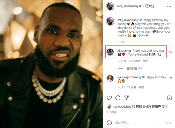此前詹嫂祝贺老詹生日快乐,萨瓦娜晒照并配文写道:生日快乐,我的宝贝!!愿今年带给你无尽的爱、幸福和健康。我爱你!!祝你愉快!