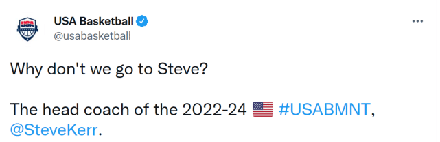 “随着今天的任命,我们的国家队男篮将开启对2023年世界杯和2024年奥运金牌的追逐,”退休的美国男篮主席马丁-邓普西说道,“我代表所有和美国篮球相关的人,感谢这四位出色教练。”