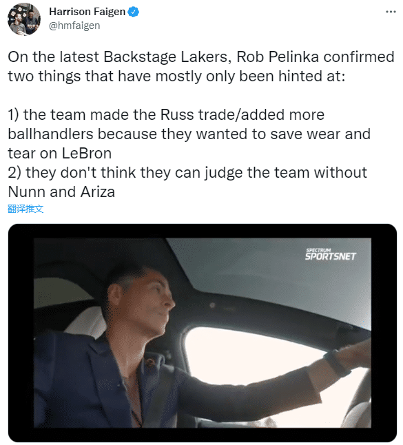 湖人记者HarrisonFaigen对佩林卡的发言片段发推总结道:佩林卡确认了两件之前主要被暗示的事情:1.球队交易引援威少和引入更多持球手是为了减少对詹姆斯的身体消耗;2.他们认为在纳恩和阿里扎回归之前,他们不能评判球队实力。