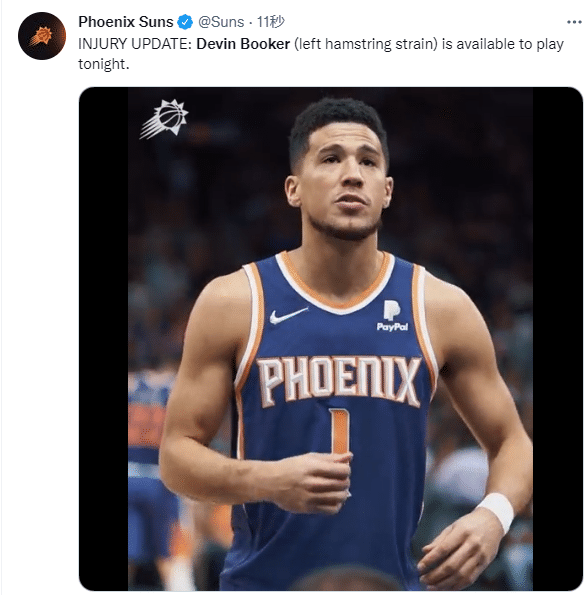 布克是在12月1日对阵勇士的比赛中受伤的,当时他仅打15分钟贡献10分就早早因伤退出比赛;自此之后,布克一直在养伤,因伤连续缺席7场比赛,养伤19天终于康复;布克复出对阵黄蜂,他将让太阳的进攻火力更强,也能为保罗分担压力。